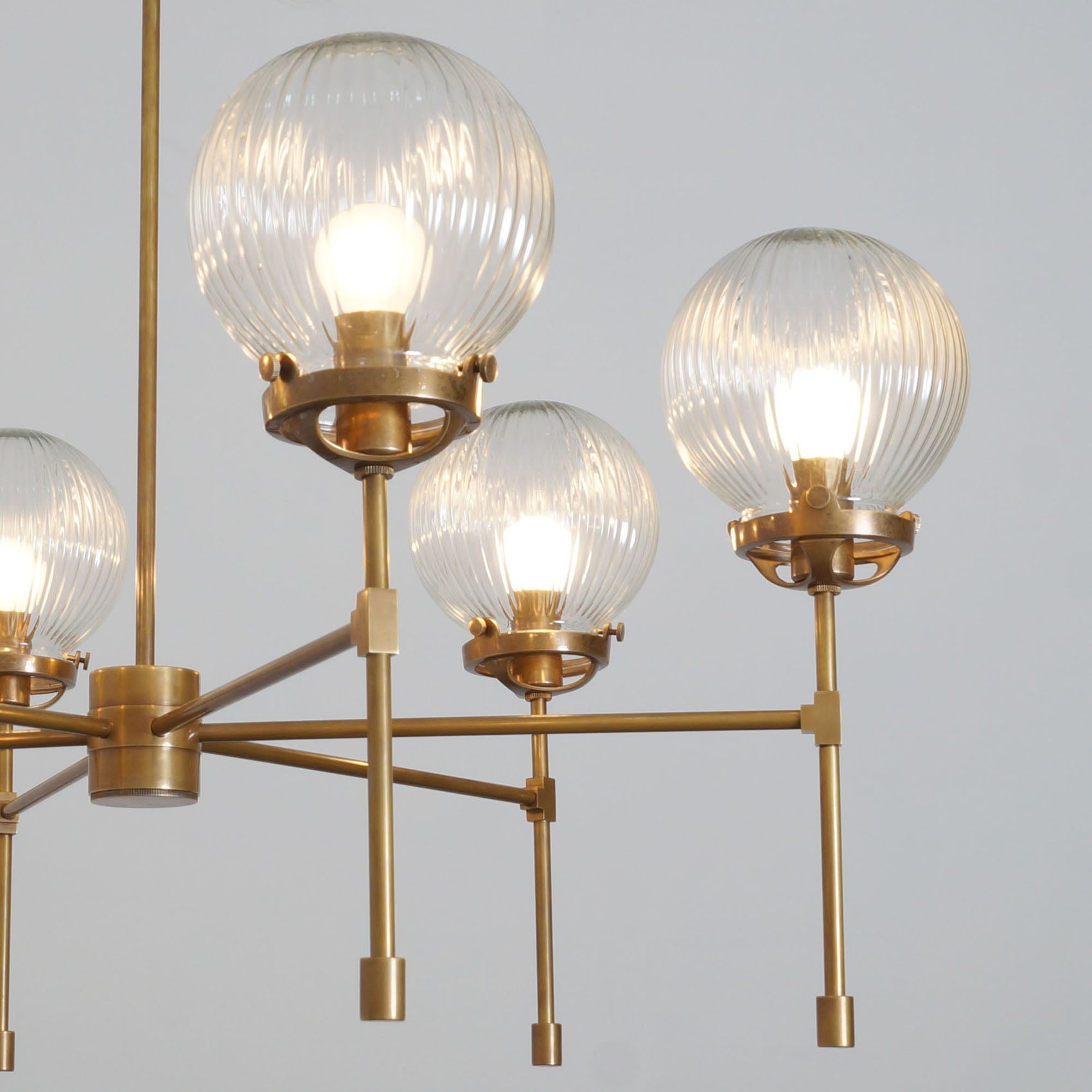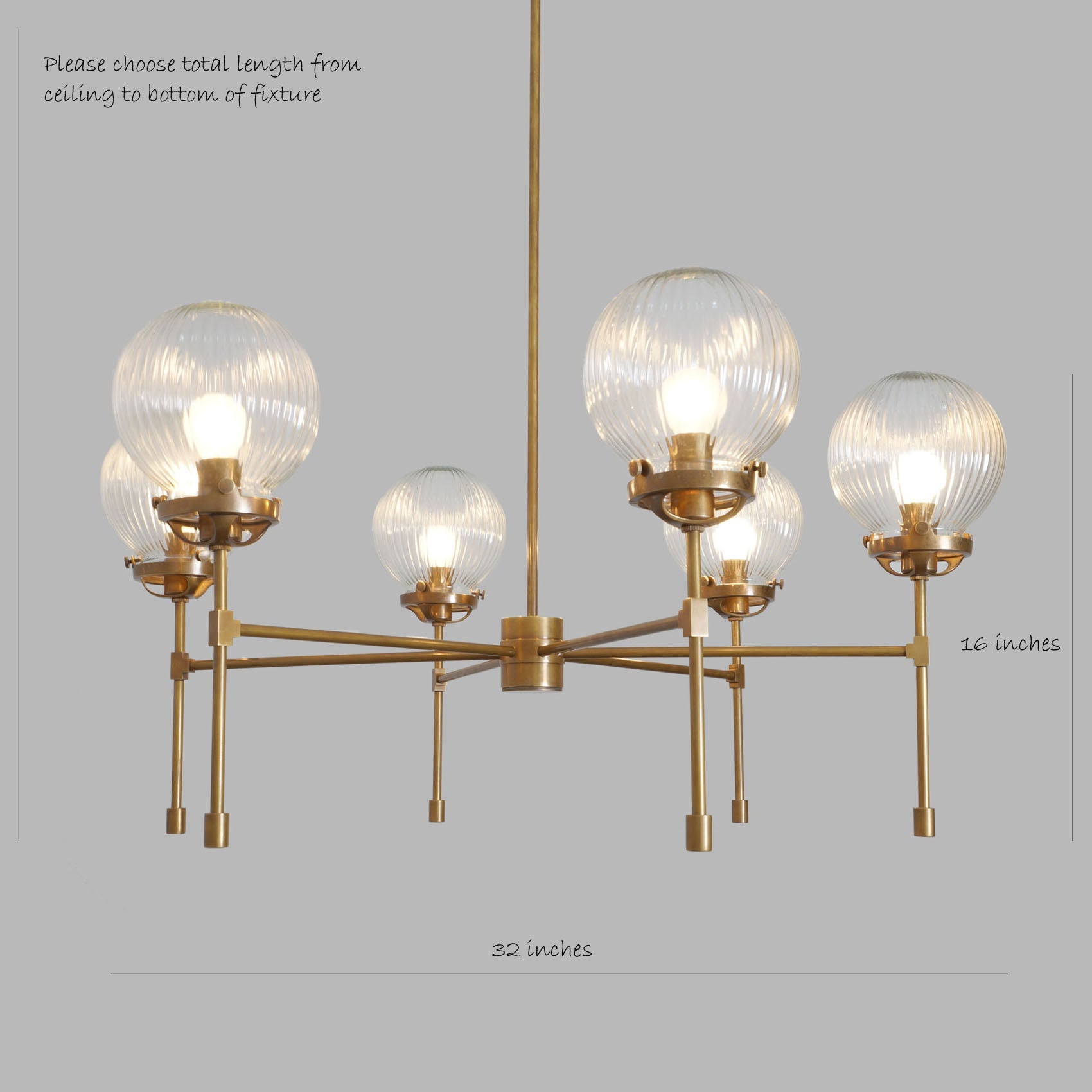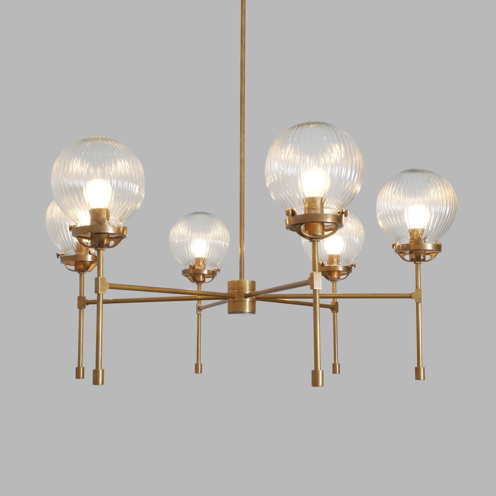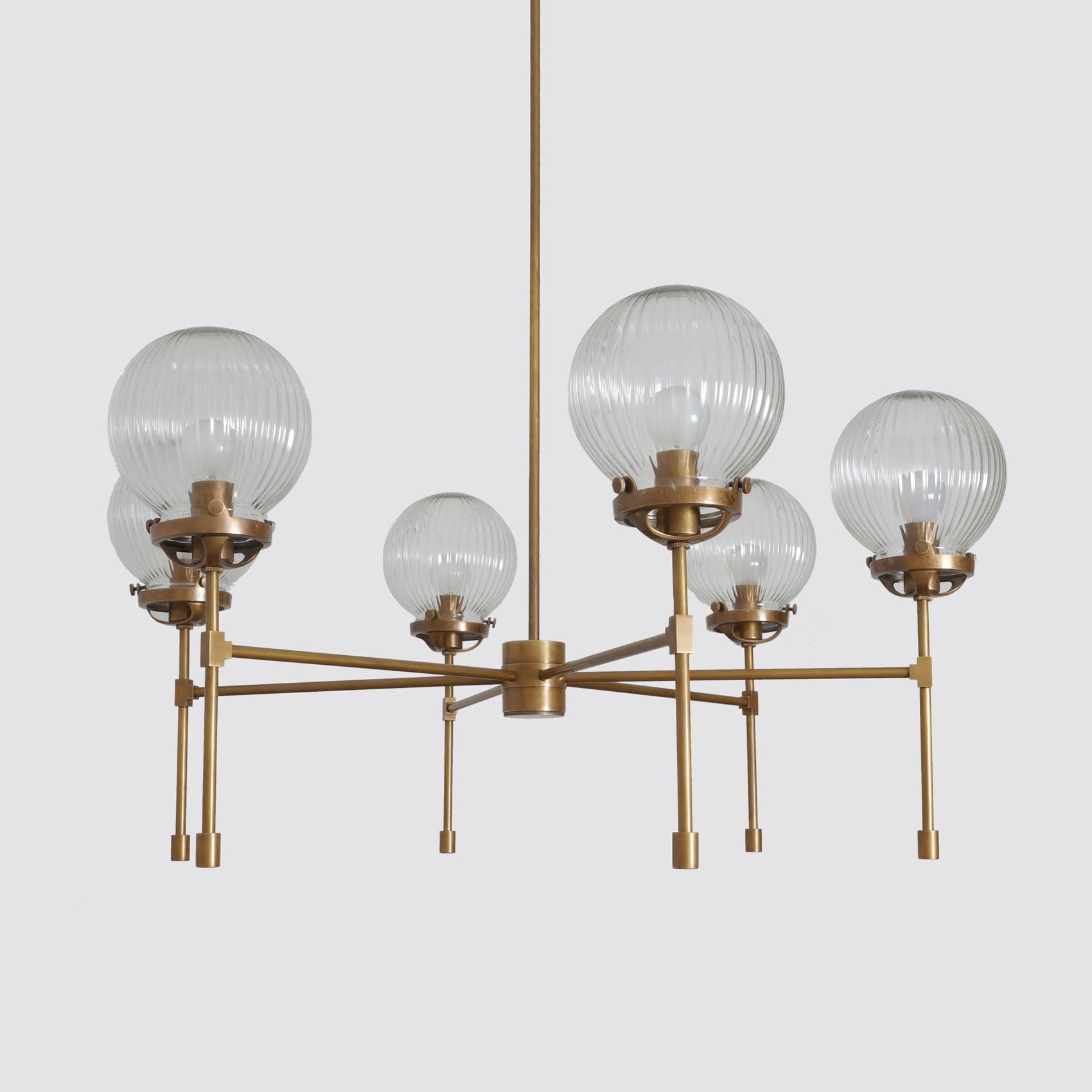 The chandelier is crafted from pure-brass with a handsome patina that gives the look elegance and sophistication. featuring 6 ribbed glass globes for a touch of elegant, old-world style on a transitional heritage-brass frame.