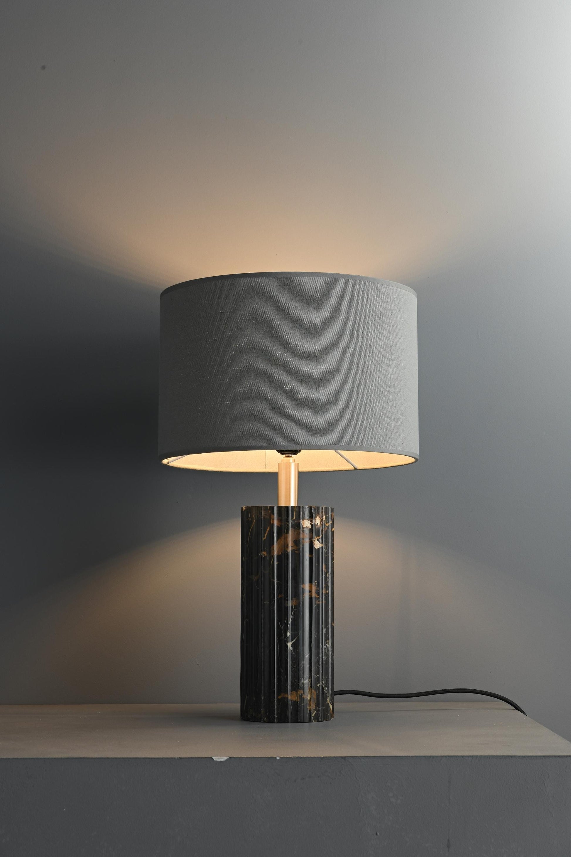 To install the black marble table lamp, place it on a stable surface and plug it into an electrical outlet. Insert the correct bulb into the socket under the cloth shade. Finally, switch it on to enjoy its warm, ambient lighting.