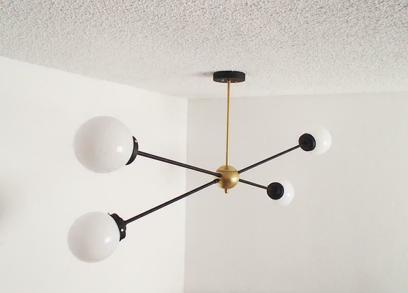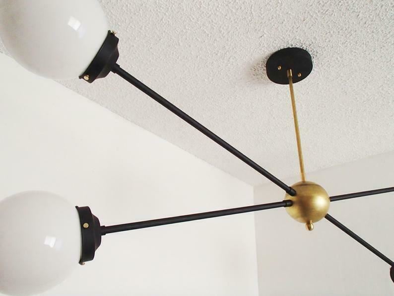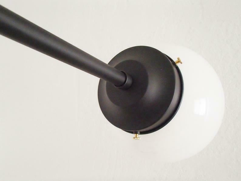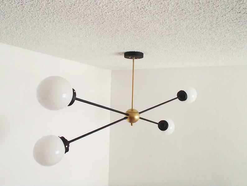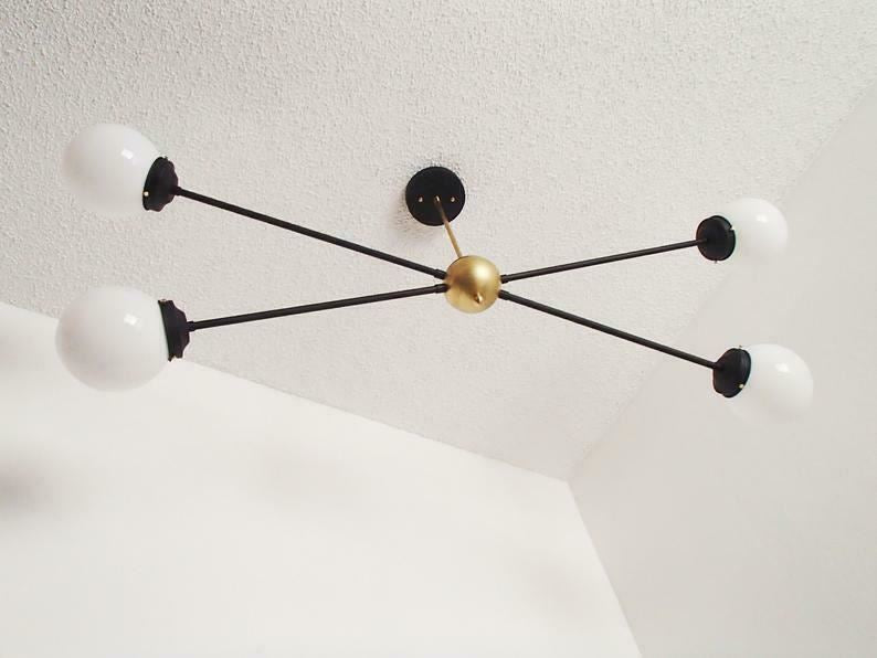 Product Details Spanning over four feet long, finished off in classic complimentary brass and matte black, this fixture will be the center of attention in any room. Milky white frosted glass globe shades adorn each outreaching arm, and equipped with medium base E-26 sockets. Shown with 12" drop rod, selection from a number of lengths to suit your needs.Product Specifications - Raw Brass and Matte Black finishes - Four 6" white glass frosted globe shades - Rods : 1 x 8", 2 x 12" and 1 x 15" drop rods are included. custom rods are available at request. - 25" overall height with 1 x 12" drop rod. - UL Listed for dry locations - Set of four medium base E-26 lamp holders, rating: 600w / 250v, compatible with LEDs (recommended!), dimmers, 230v electrical systems. Max. 60w bulb suggested. Materials - Pure Brass, Glass globe. Illumination - 240V. Finish Color - please message me for brass finish color. |