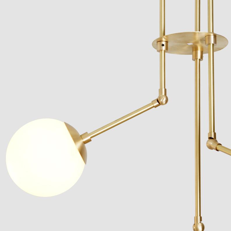 The Stunning 3 globe balance Chandelier is an a truly elegant design, featuring a modular pure brass structure. The super contemporary design features milky white glass globes are secured to the ends of long, elegantly shaped brass branches. Each branch can be adjusts to take on its own unique shape, and to create a flowing design that fits perfectly into any mid century modern or contemporary decor.