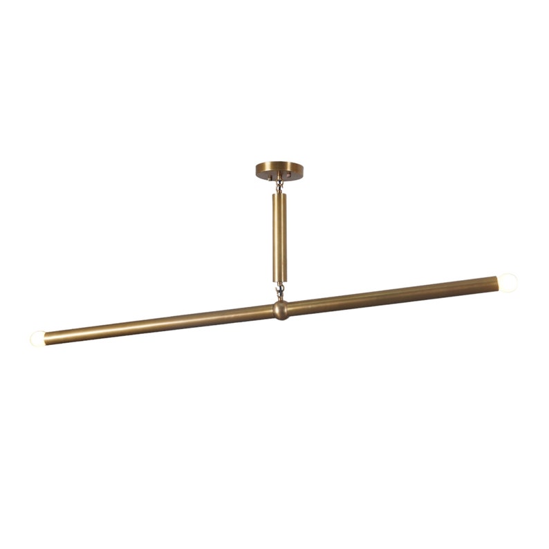 Two Ribbed Glass Globes emit a welcoming spread of light on this linear pendant. Shades are attached to tapered brass stems. The round bar is suspended by two adjustable-length stems with chain. This chandelier's design carries influence from Scandinavian, Danish, French, and Italian Mid-Century Modernism, creating a strong visual statement with its distinctively architectural brass fittings. customization on this lamp is available so please contact us for any customization or custom lighting.