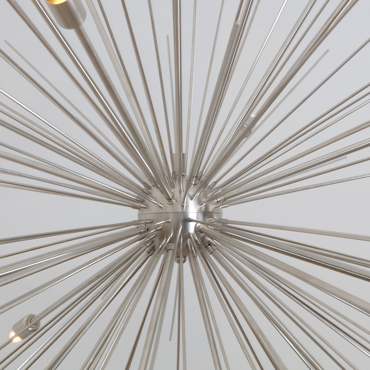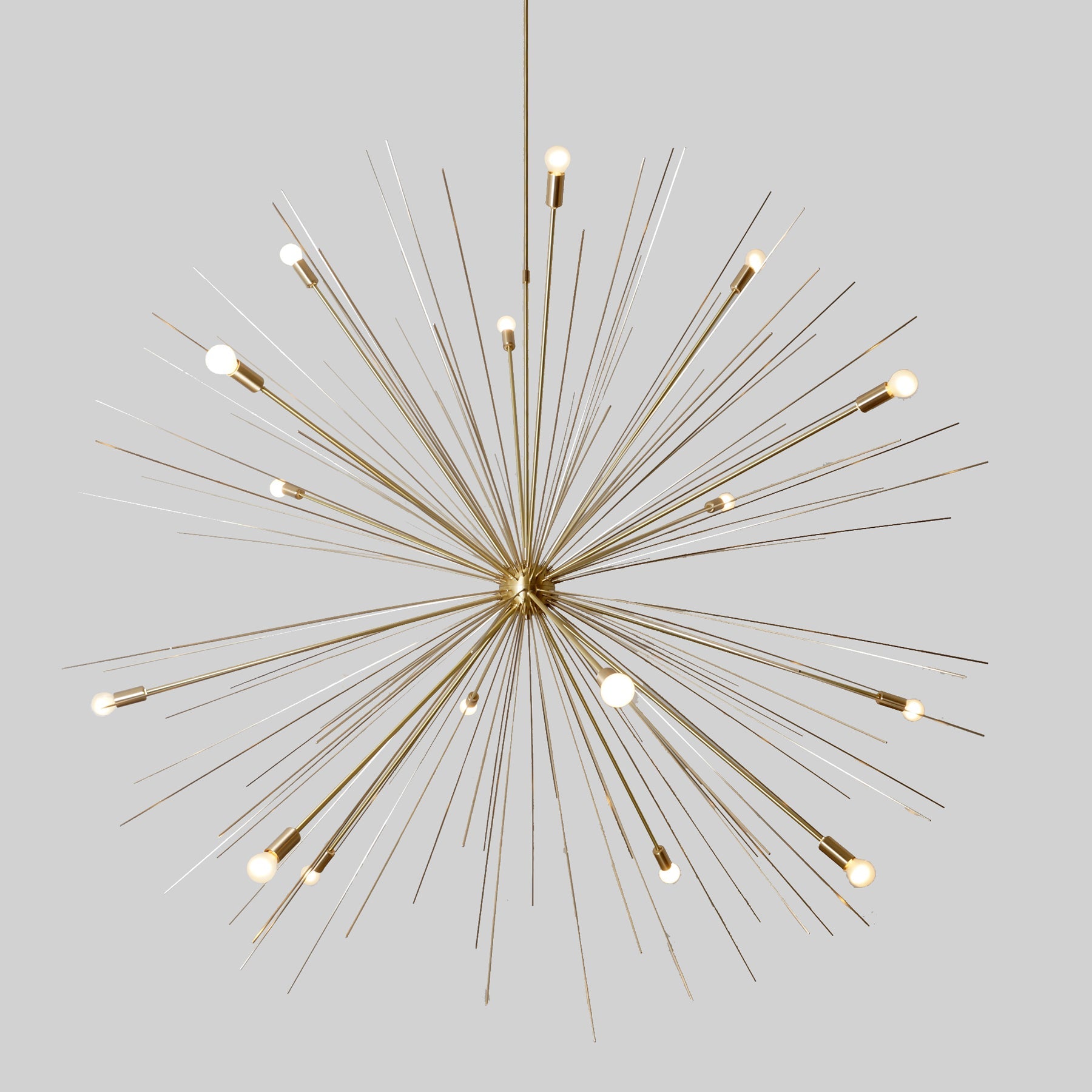 The bold modern styling creates an instant focal point. Our 16-Light round urchin Pendant chandelier is handmade of brass spikes with arms that radiate from a center globe, varying in length to echo the urchin-like rays.
