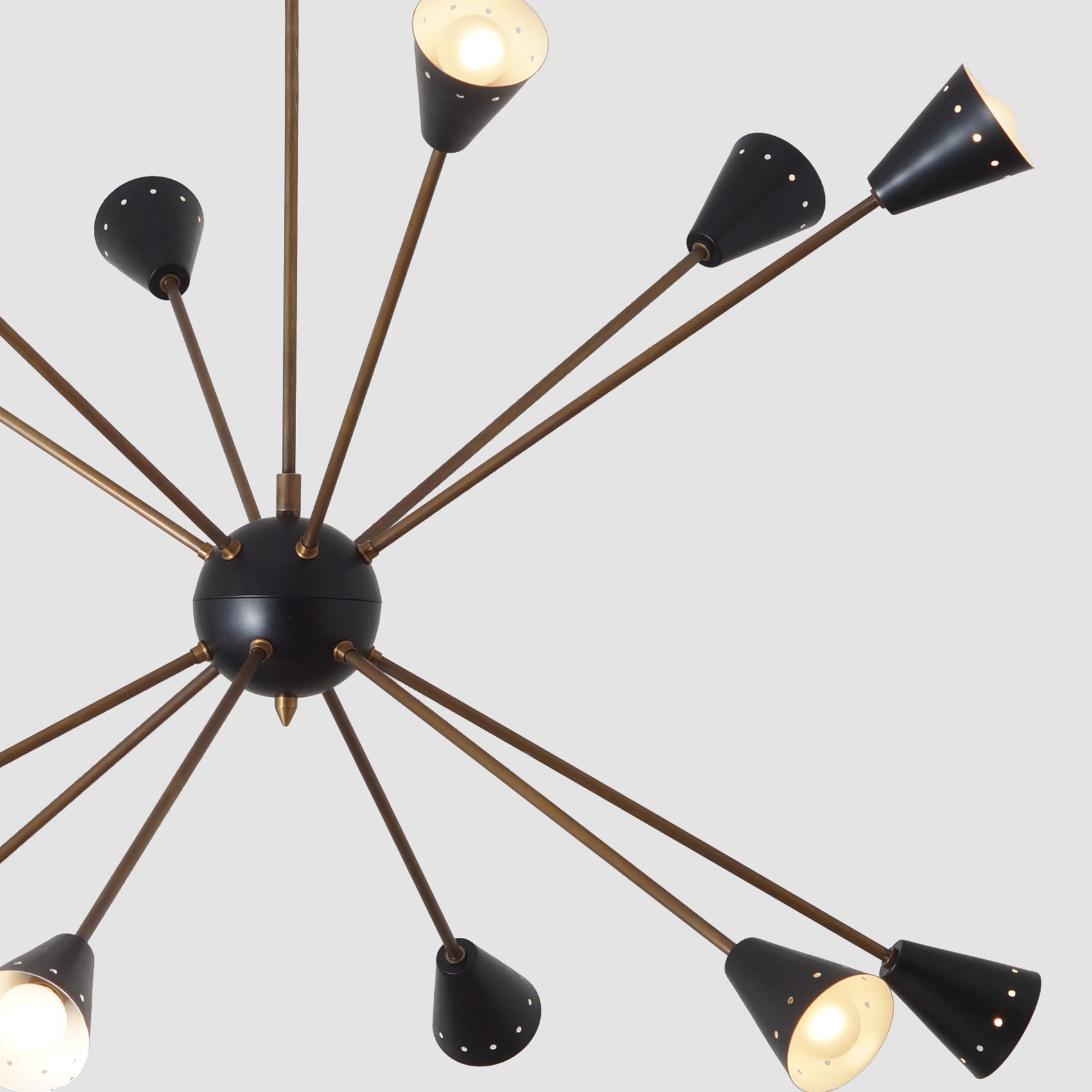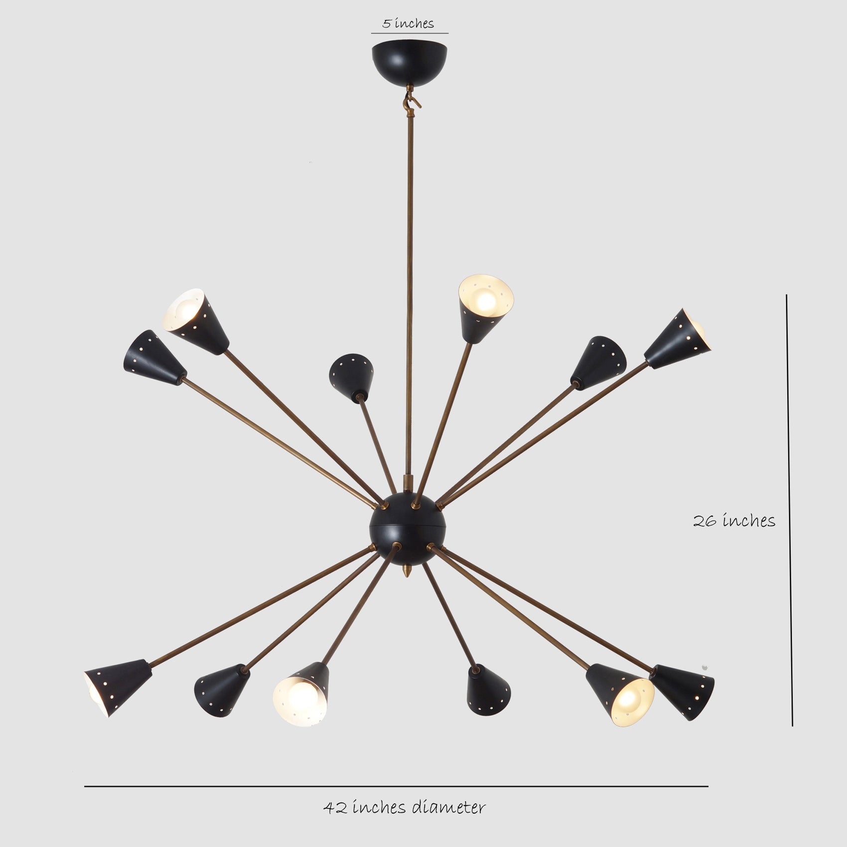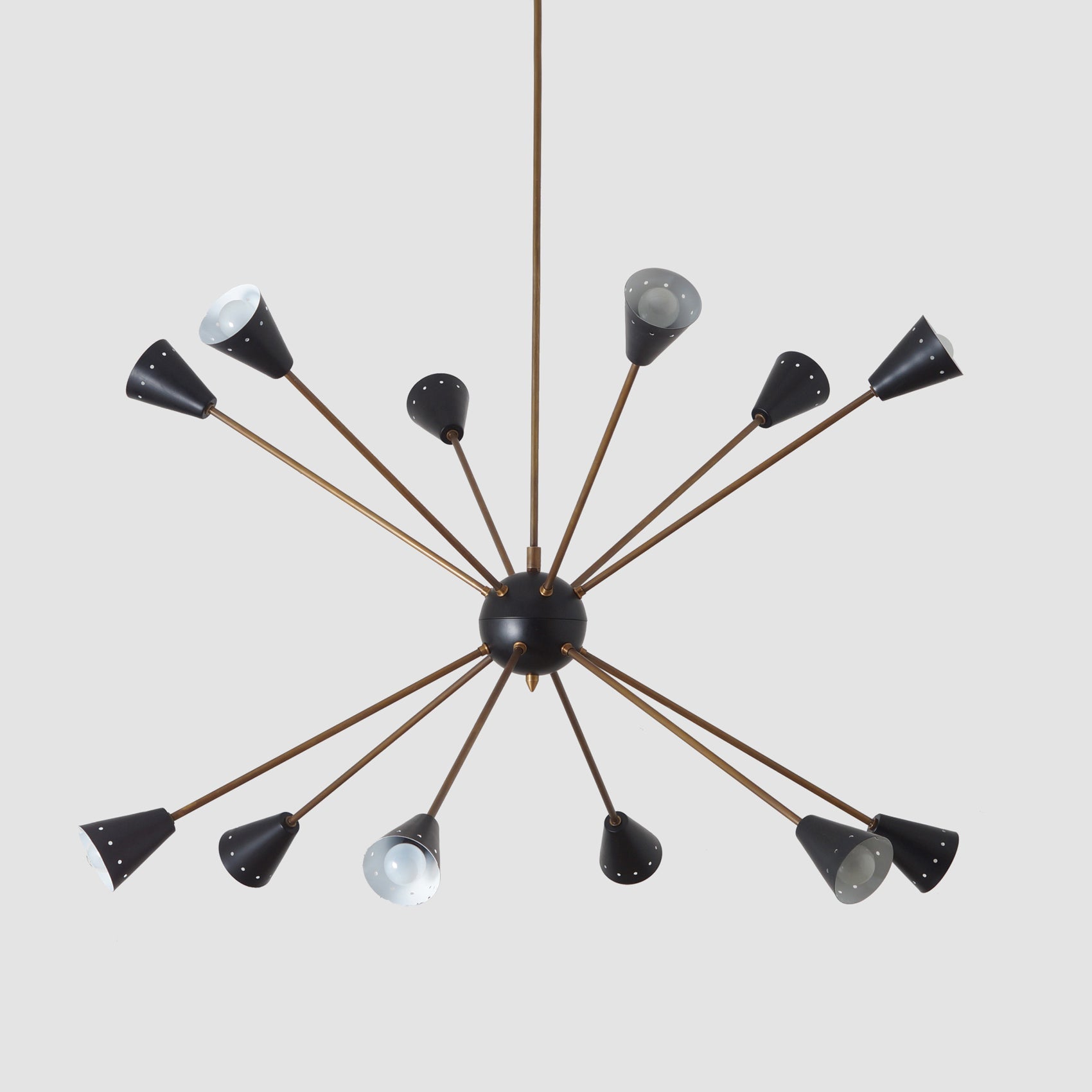 Beautiful Stilnovo Style 12 Lights light Modern Brass Colorful Sputnik Starburst Light Fixture. The piece has 12 arms with full brass cones at the ends painted in black. other colors are available at request.