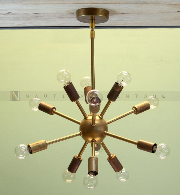 Mid Century Modern Antique Brass Sputnik atomic chandelier starburst light Fixture. This starburst light fixture is made with UL approved parts.