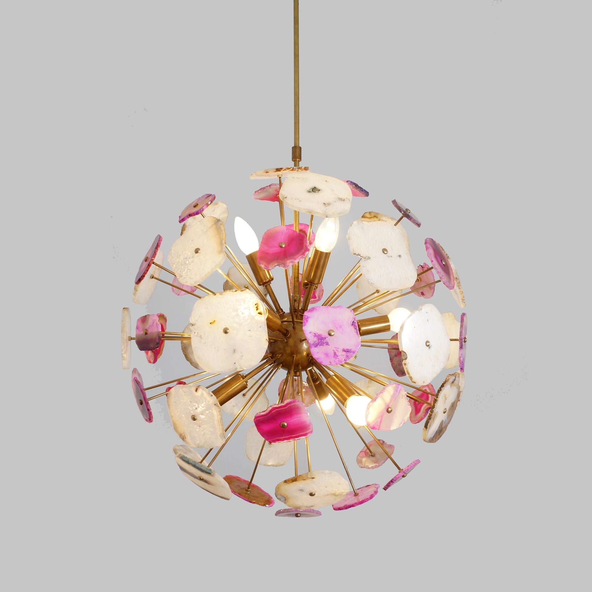 Stylish modern agate sliced orb chandelier with 8 lights, pure brass material body. Very precious polished agate stone chandelier on a brass fixture.