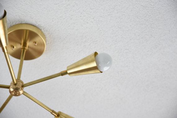 Stunning 5 arm chandelier available in brushed brass or powder coat matte black. Handmade with top quality components. Options upon checkout allow you to choose a down rod length. "Total Drop Length" refers to the distance from the ceiling to the bottom of the fixture, we will include the down rod necessary to achieve that length. If you need a length longer that what is offered please contact us. Takes ANY standard medium based bulb including Edison, CFL, LED, and traditional incandescent. Constructed of solid brass parts, no plating.Selection of finishes are available.