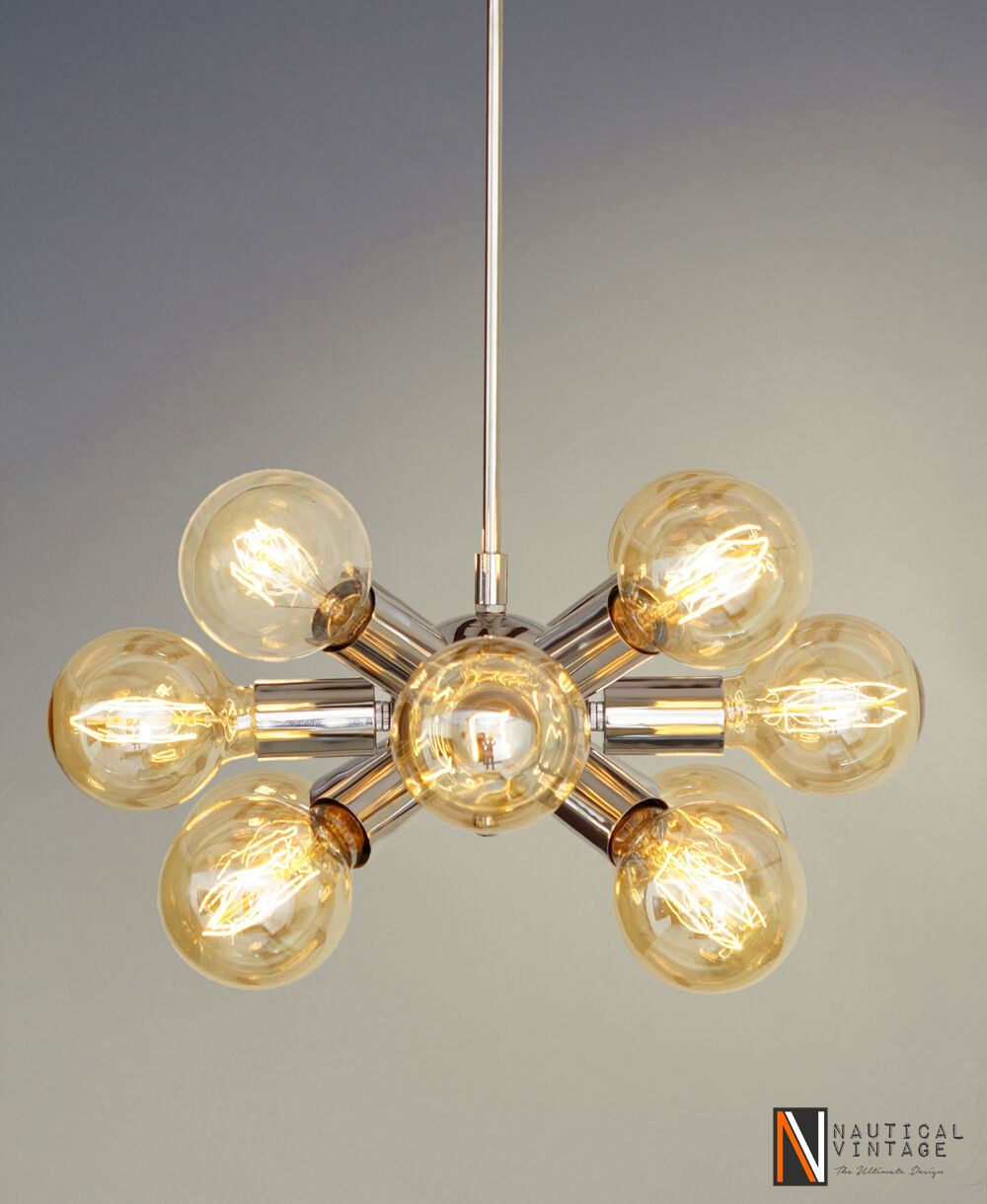 Mid Century Modern style chrome Brass Sputnik atomic chandelier starburst light Fixture. This starburst light fixture is made with UL approved parts.