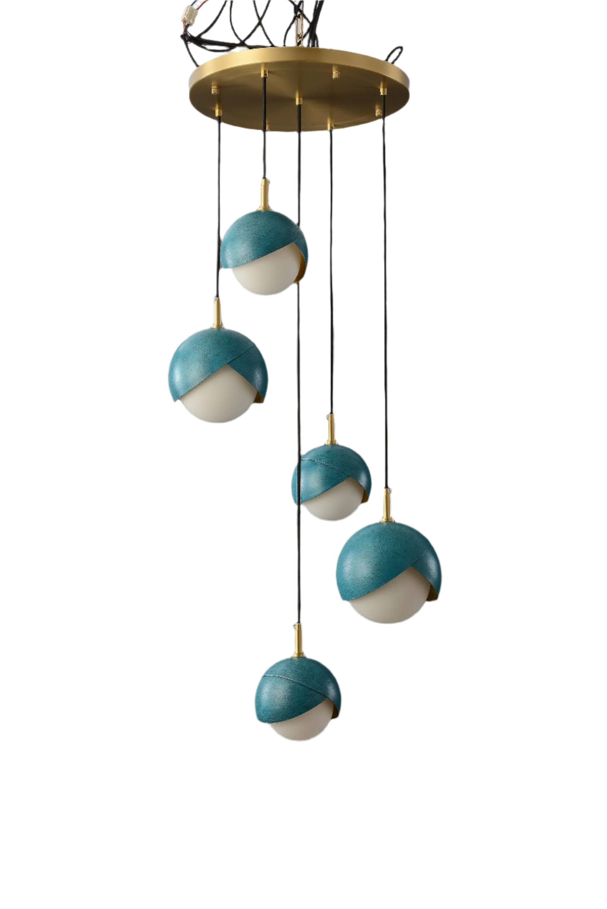Take your space a little higher with our intricate copper and iron art chandelier. It has deep sea blue highlights enclosed within a distinct black acrylic shell. It is a piece of art and a chandelier; it is superb and has a raw look.