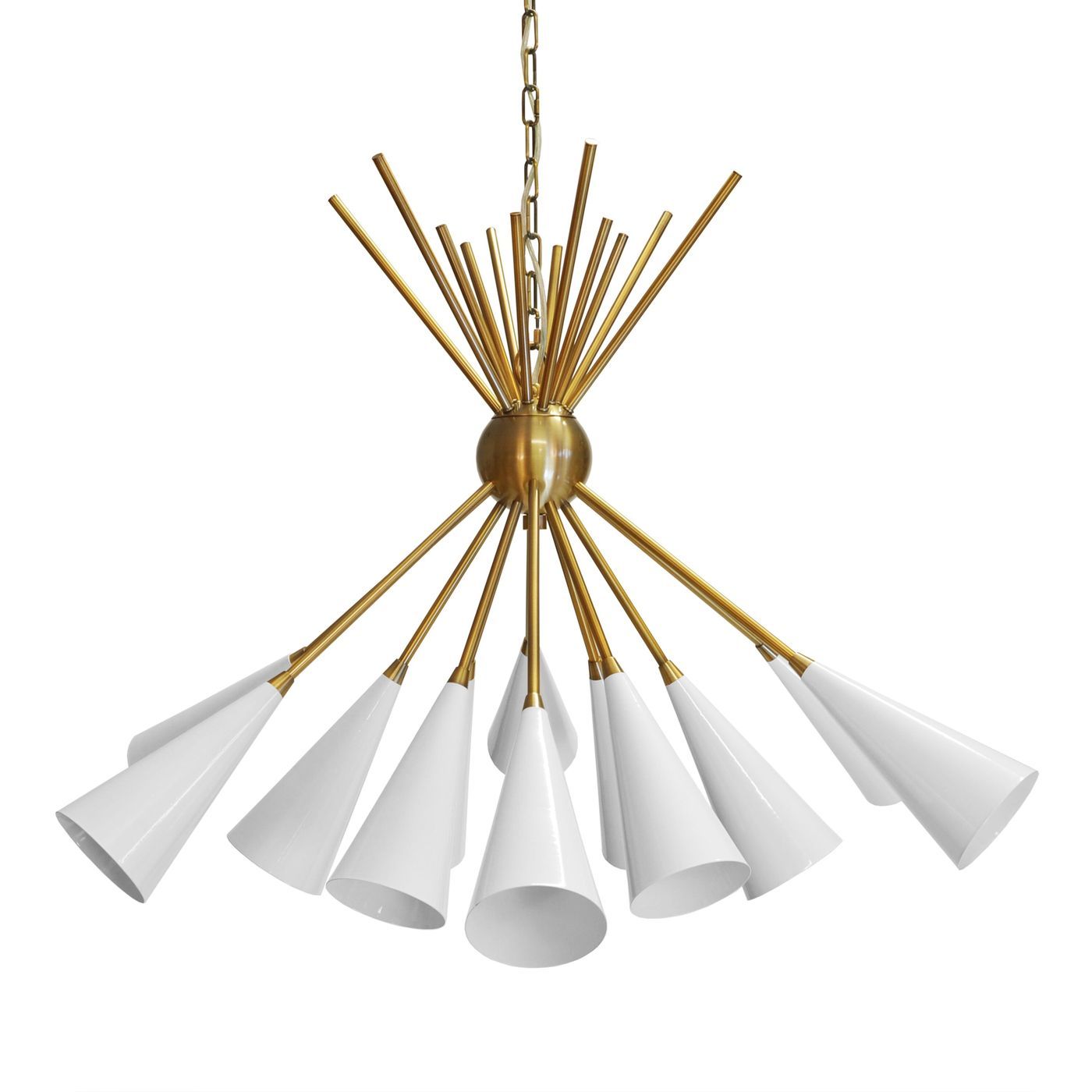Garland 12-light chandelier has a beautiful, timeless appeal. This twelve light cluster chandelier in antique brass with matte white shades will surely make a statement in any living room.