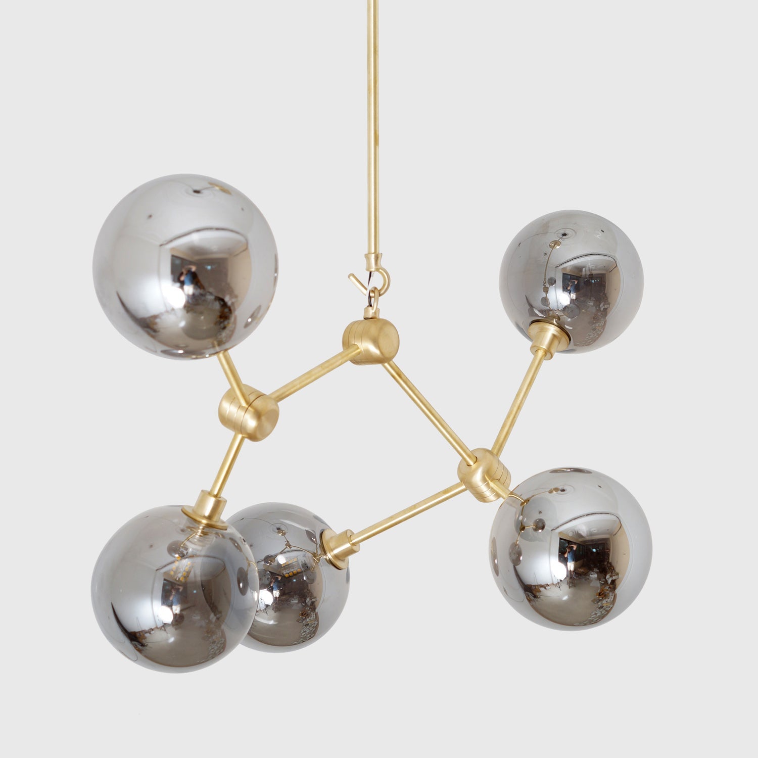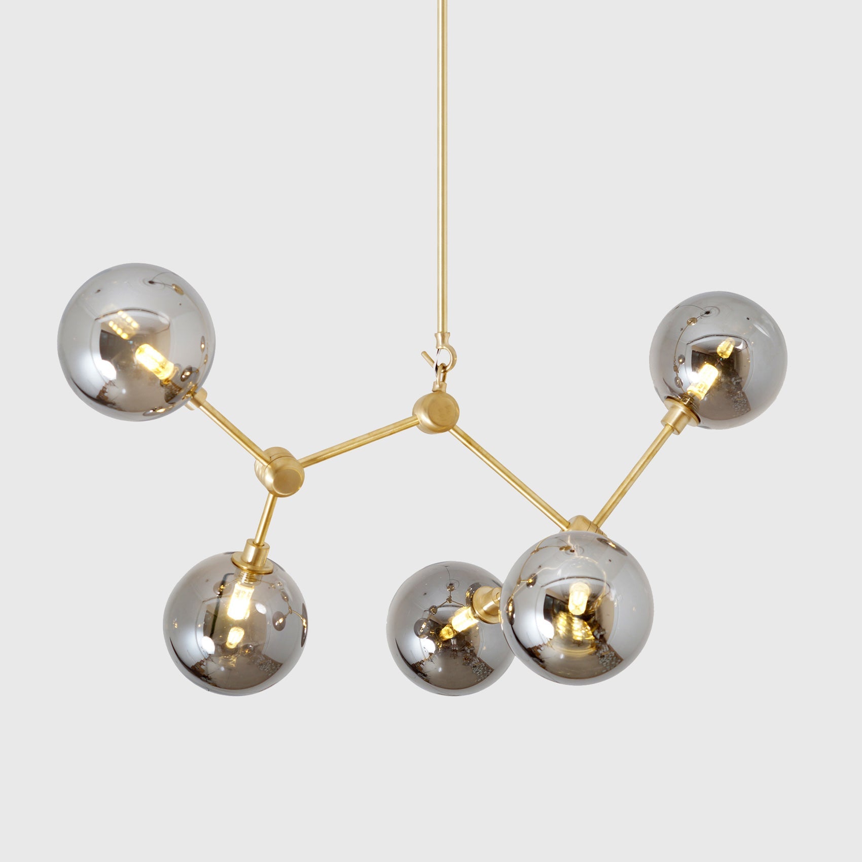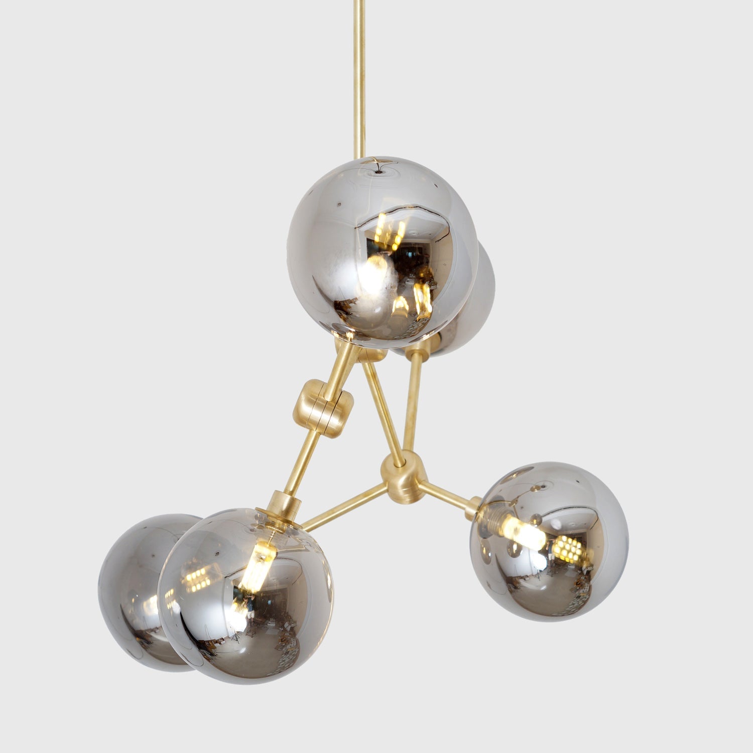 The Stunning 5 murano mercury globe branch Chandelier is an a truly elegant design, featuring a modular pure brass structure. The super contemporary design features mercury globes that are secured to the ends of long, elegantly shaped brass branches. Each branch can be adjusts to take on its own unique shape, and to create a flowing design that fits perfectly into any mid century modern or contemporary decor.