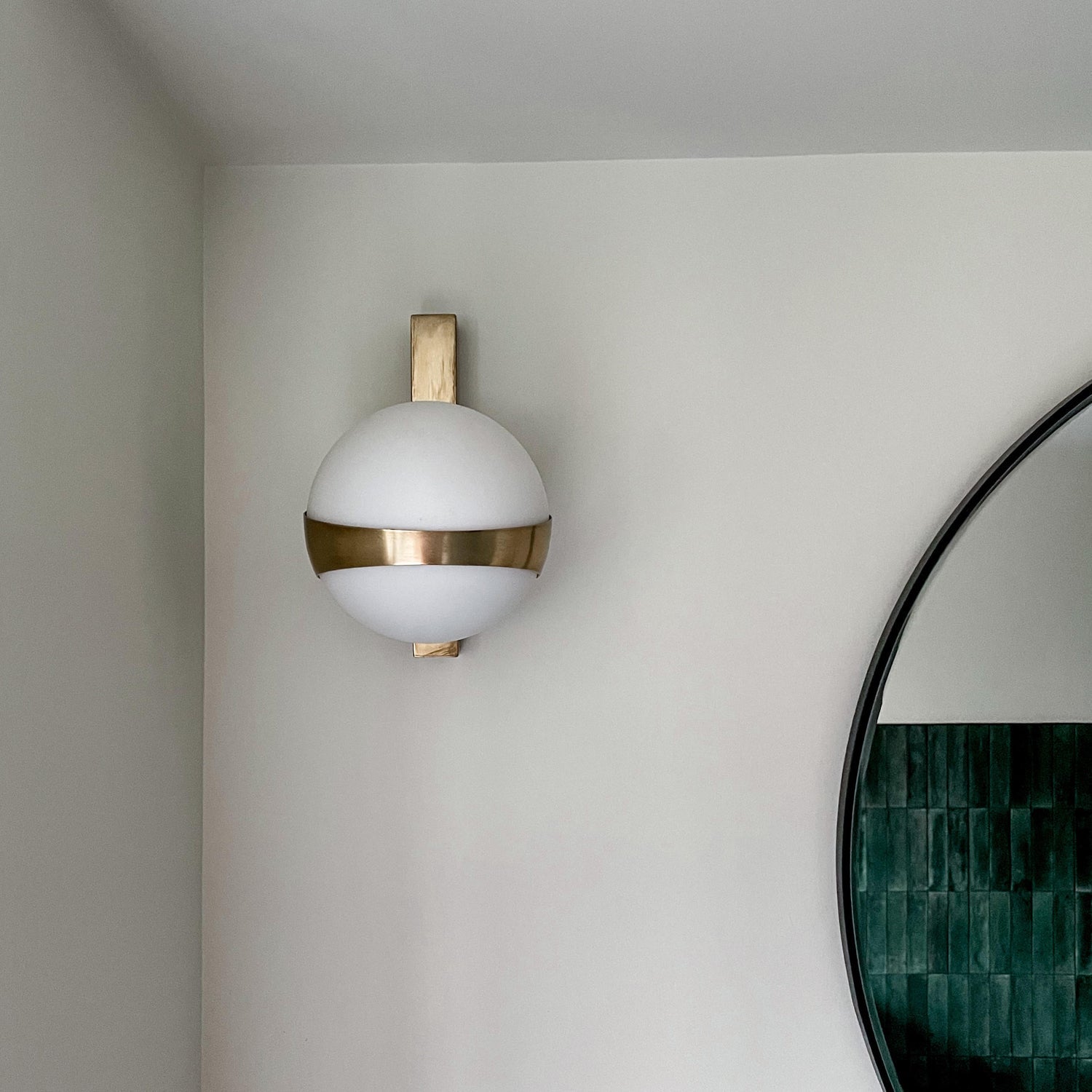 • Constructed with brass and opaque white shade.