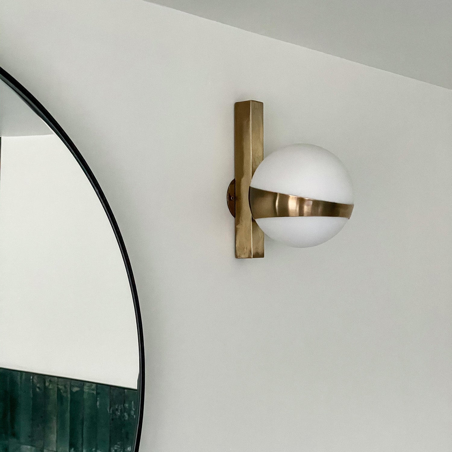 Contemporary handmade seychell wall sconce inspired by Italian design of 50's in the taste of stilnovo. structure is solid brass and lamp shade in opaque white opaline