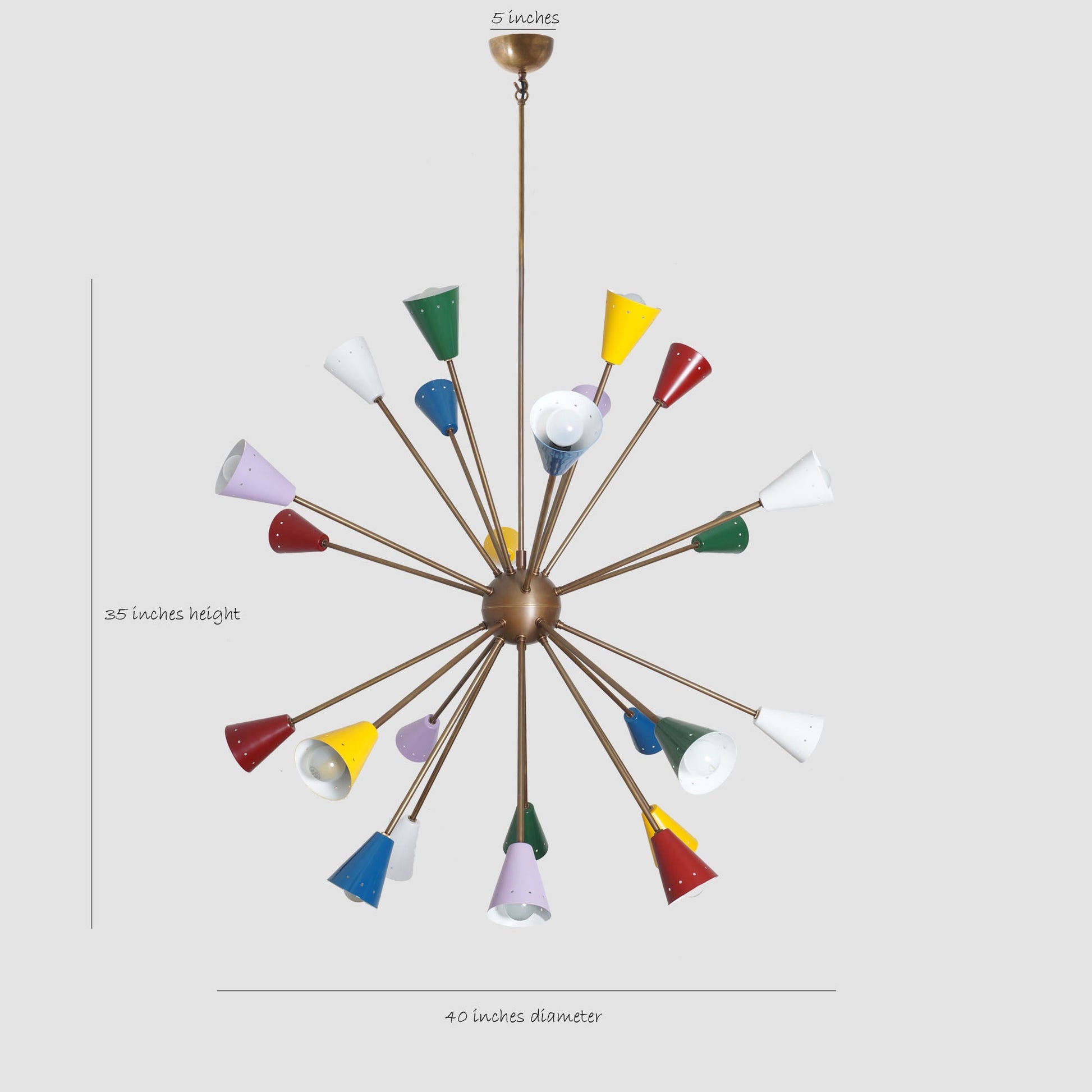 Italian Sputnik chandelier made by 24 fantastic metal of various multi colors painted cups, structure in pure brass. An amazing way to add some pop color to your dining room, living room or other room. This chandelier easy to hang and comes with all necessary installation hardware.