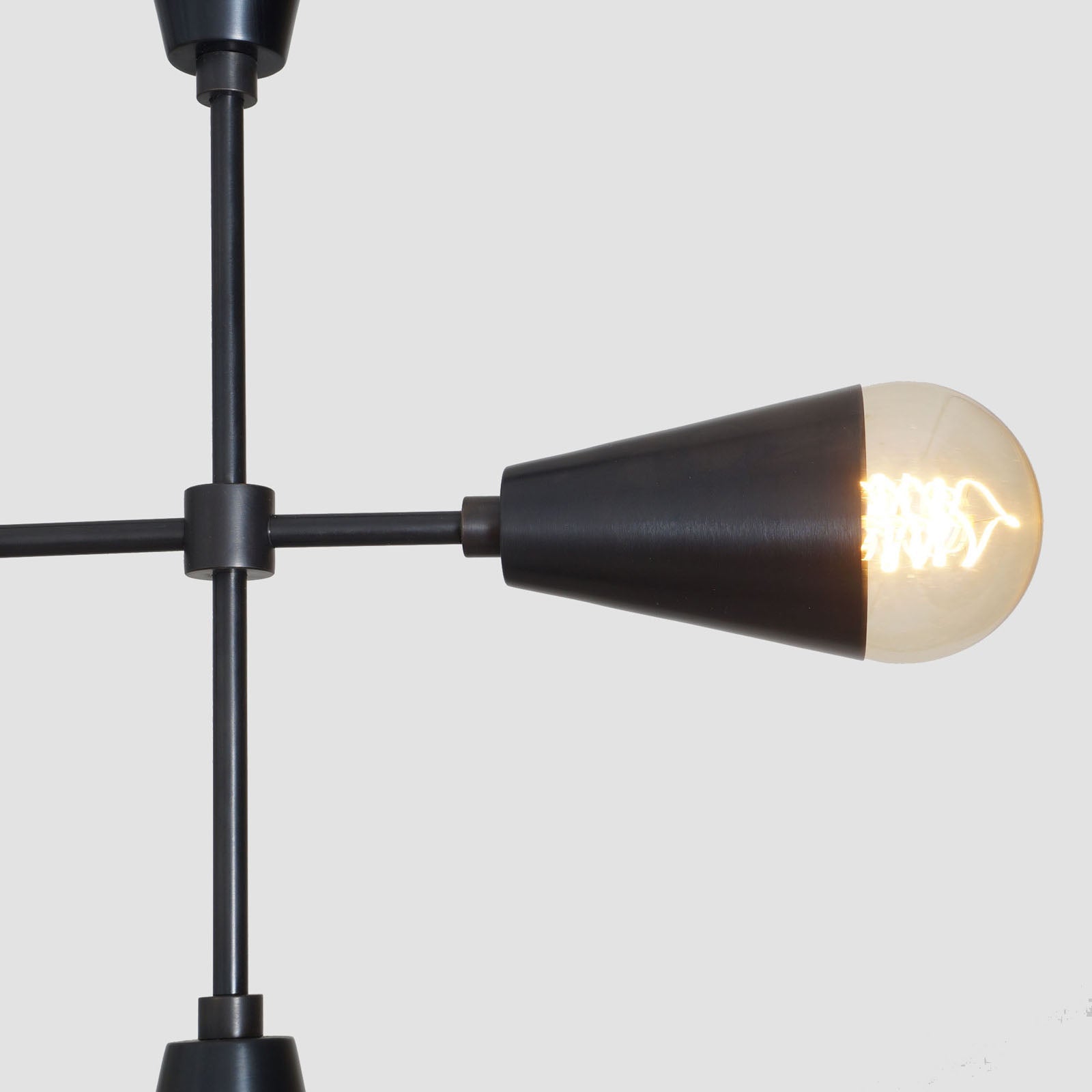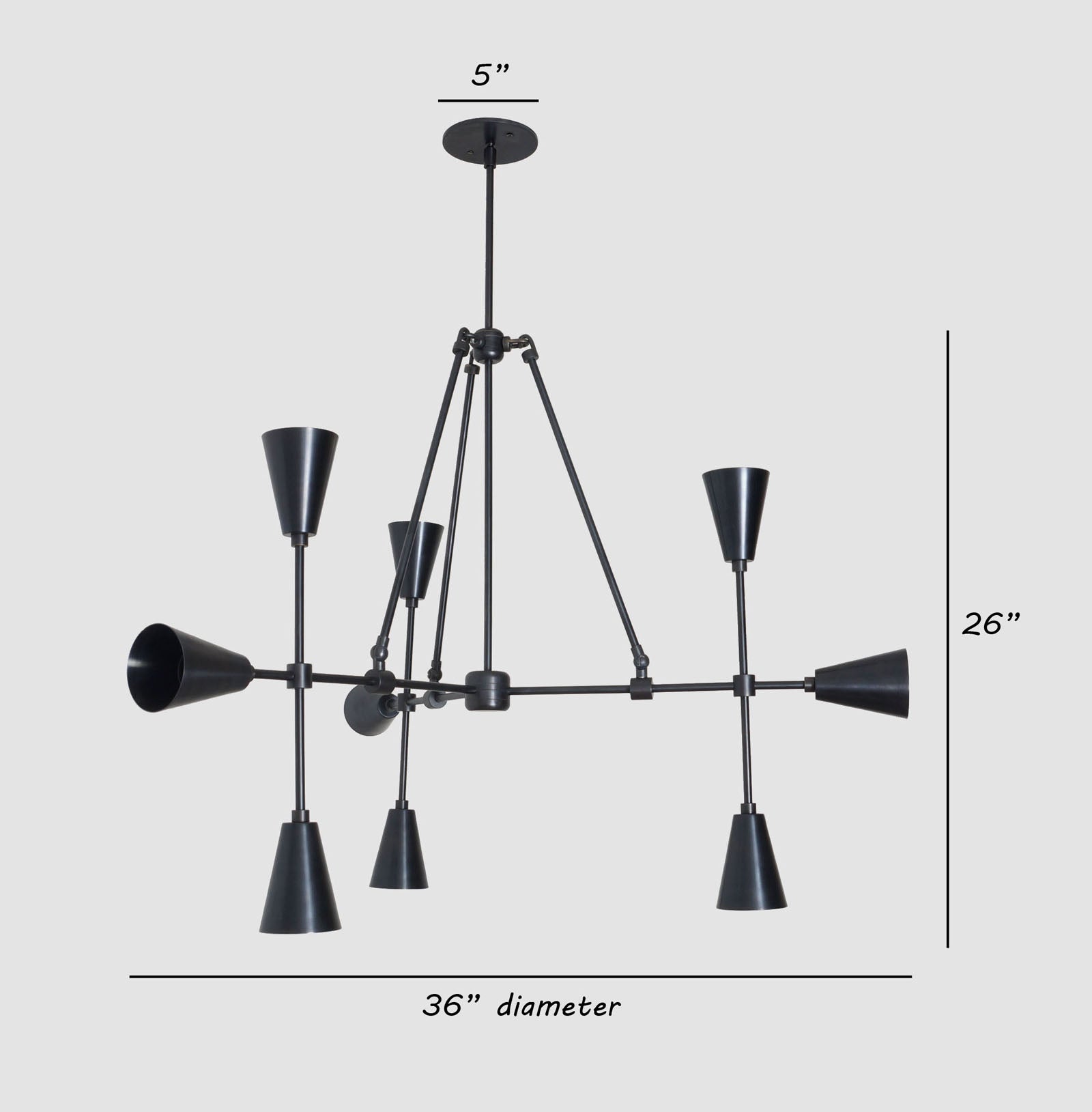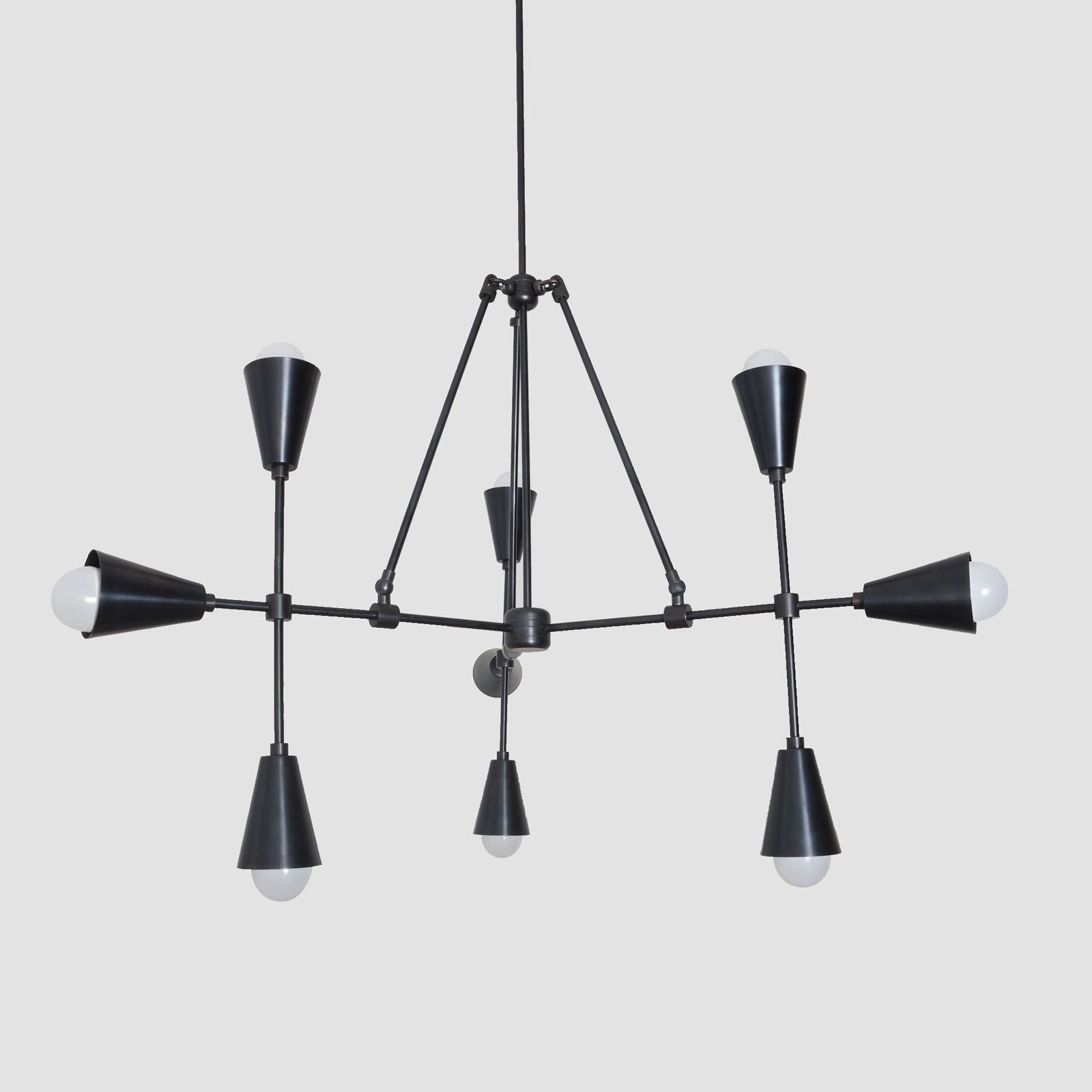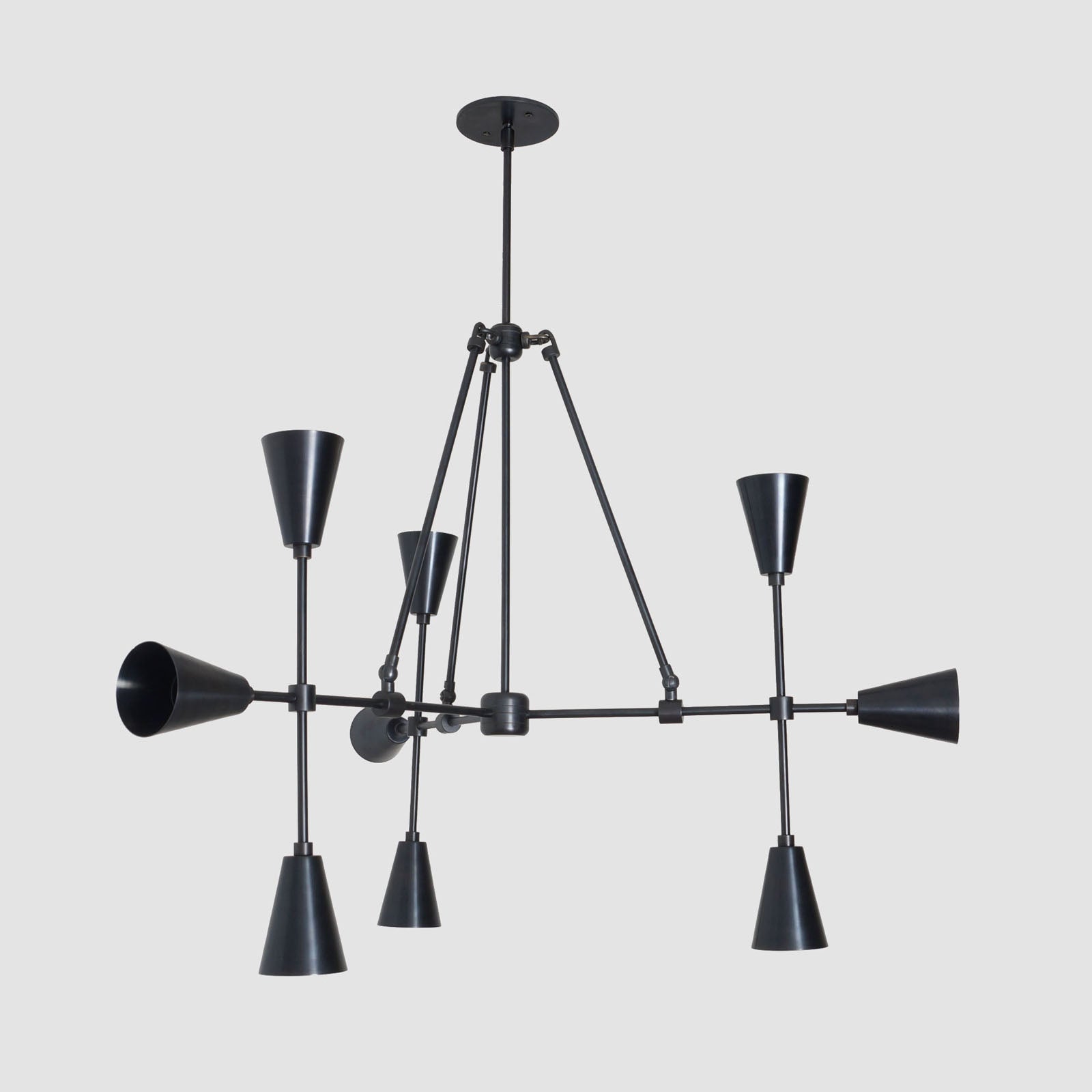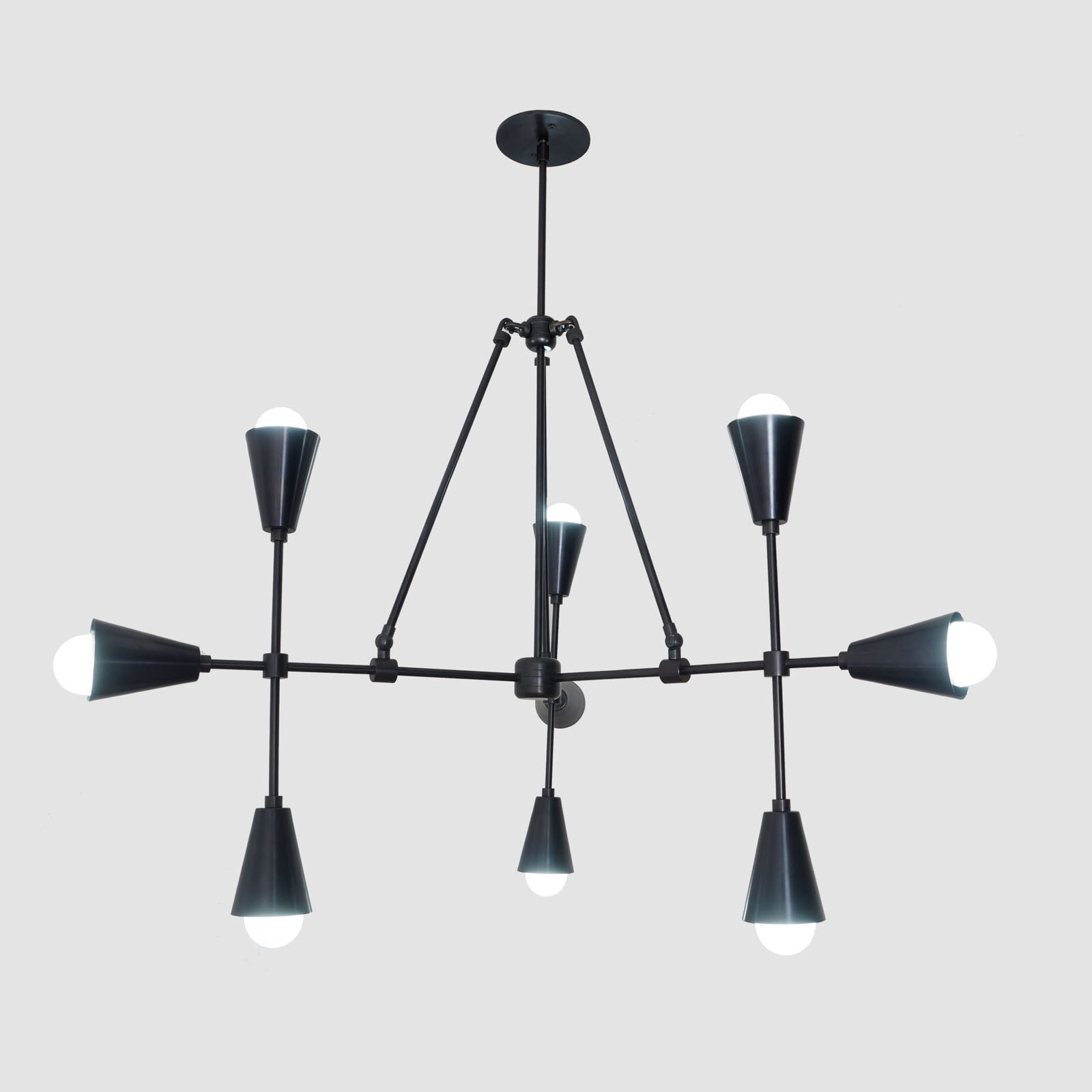 Trigon 9 is a repetitious, conical and triangular shaped ceiling chandelier. drawn upon from trigonometric principles, the large brass chandelier is available in selection of brass finishes.